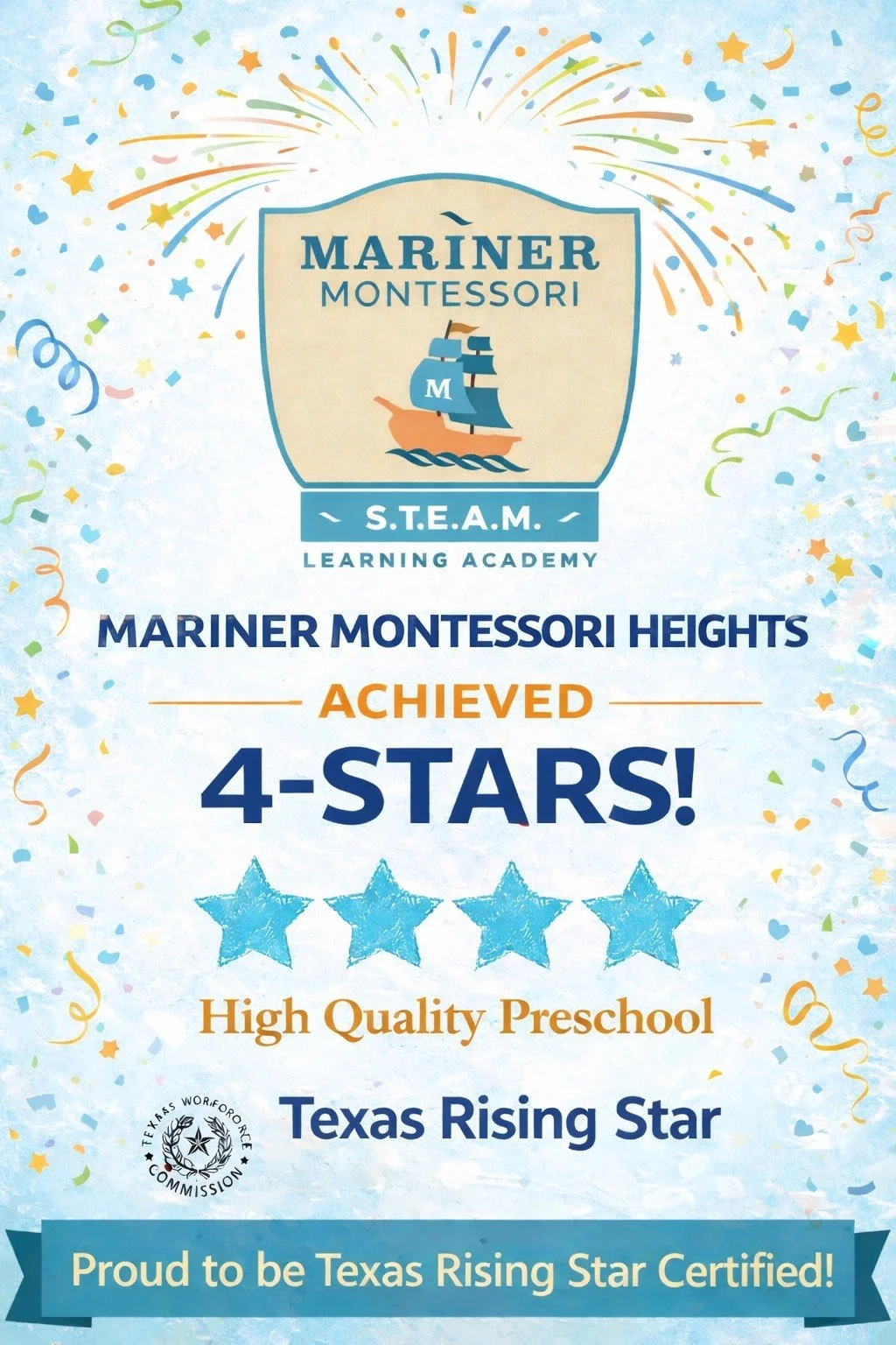 We are proud to share an exciting milestone for our school community. Last week, Mariner Montessori at the Heights officially earned Texas Rising Star (TRS) 4-Star certification — the highest quality rating awarded to early childhood education programs in Texas.